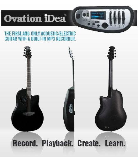 CC54i, -5 (Black)Your Digital Creative PartnerThe Ovation iDea is the first and only guitar to feature digital MP3 recorder/player. Integrated into the onboard Ovation preamp, the device provides a fast and easy way to record musical phrases, vocals, and commentary-even entire songs-using your guitar. A spruce top and modified bracing gives the CC54i iDea ample projection and solid tone. Ovation's classic Mid-Depth composite body delivers balanced acoustic tone and is comfortable to hold and play. The iDea's slim neck has an electric-style profile, 20 hand-finished nickel-silver frets, and low factory-set action, and a cutaway insures easy access to the entire fretboard. Wave Port soundholes set the iDea apart from Ovation's other soundhole designs, and the "i" inlay at the 12th fret adds a distinctive touch to the rosewood fretboard.The iDea ships with pre-installed audio lessons and jam tracks, and you can download others from the web using the iDea's USB port. Record, playback, create, and learn with this groundbreaking guitar!